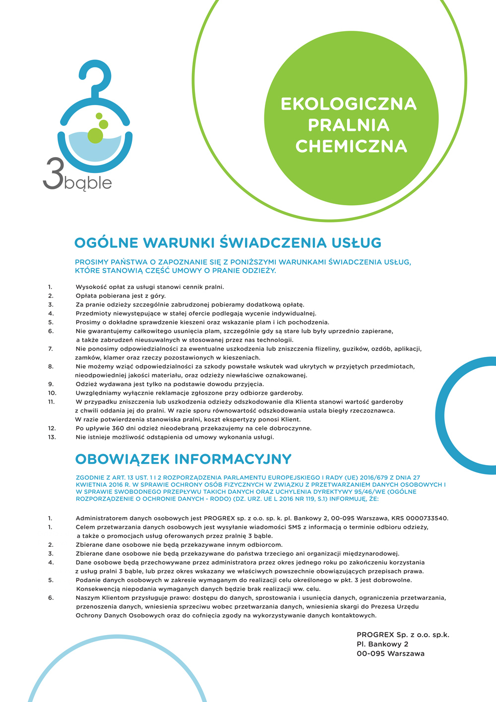 Pralnia 3 Bąble to miejsce, w którym wypierzemy wszystko: od koszul i garniturów, przez płaszcze, suknie ślubne i wieczorowe, odzież roboczą czy sportową. Świadczymy także usługi dodatkowe jak impregnacja. Obsługujemy kompleksowo firmy czyszcząc profesjonalnie odzież pracowników.